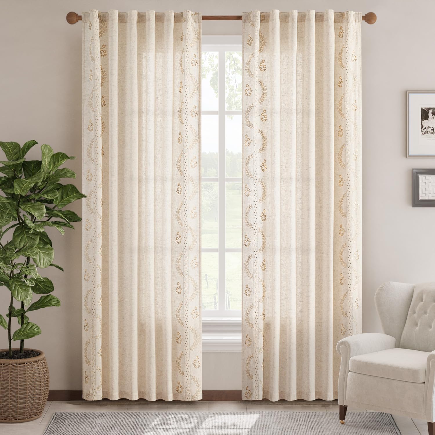 jinchan Belrose Linen Curtains for Bedroom Floral Curtains 84 Inch Length Linen Blend Beige Embroidered Drapes Farmhouse Flower Patterned Drapes for Living Room Window Treatments Set 2 Panels