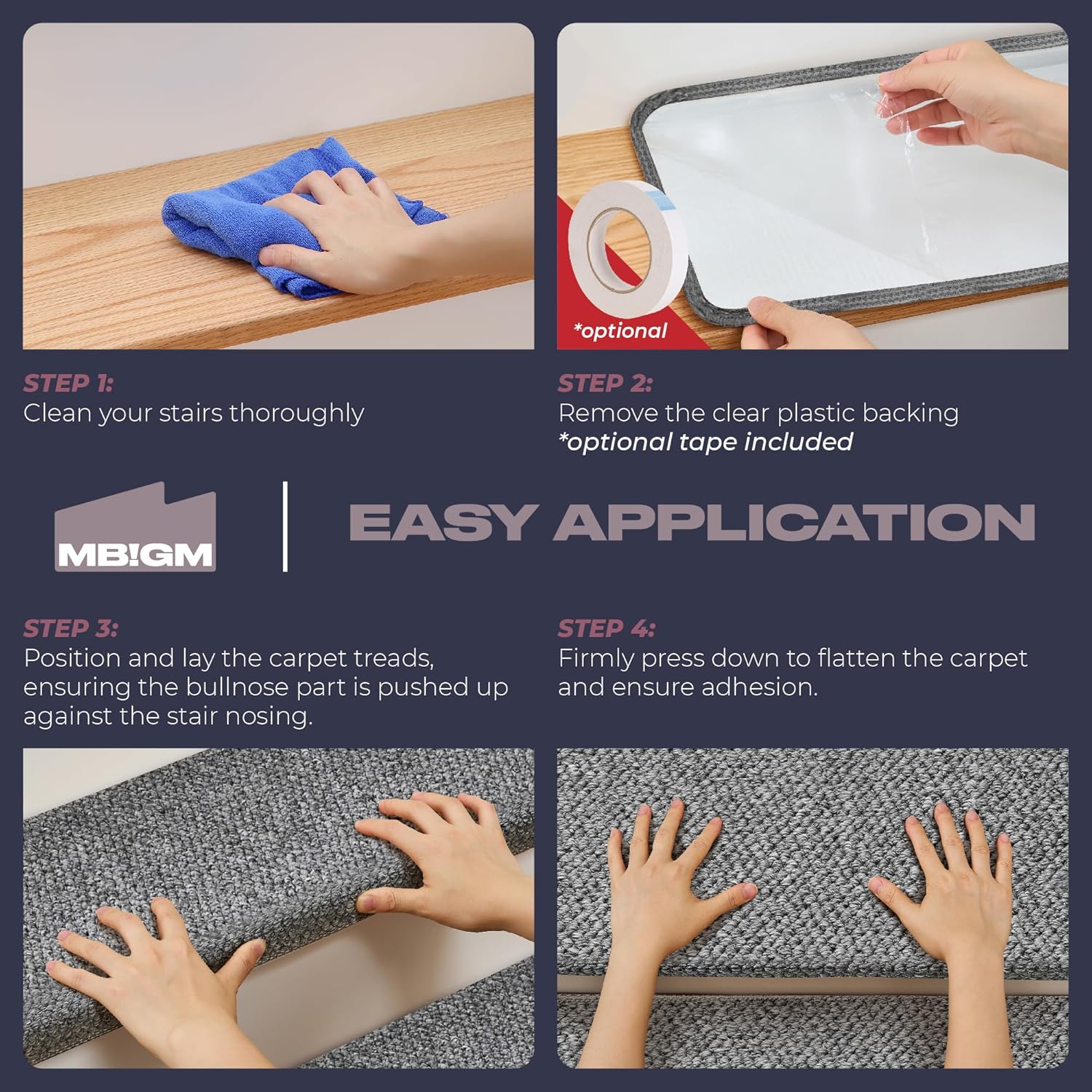 Our stair treads use TPU adhesive and steel reinforcement for a secure grip. Easy to reposition without residue. For extra adhesion, use the included tape. Ensure the surface is clean and press firmly.