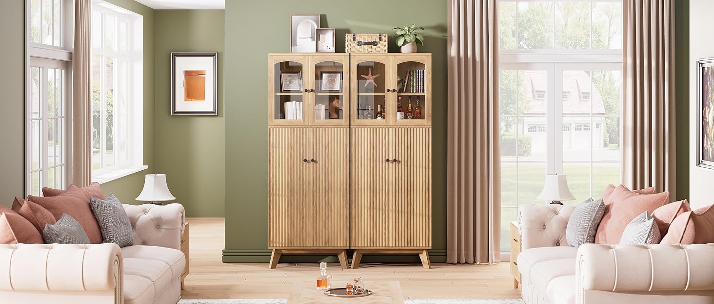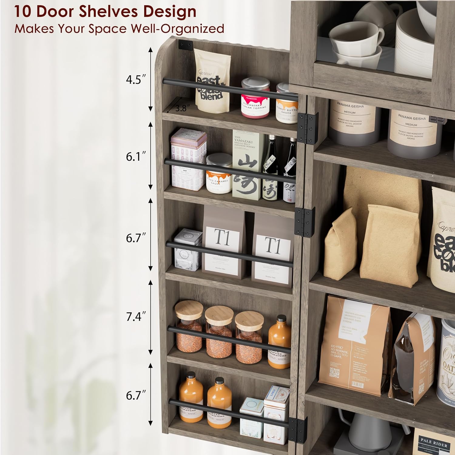 QUW 63.4" Kitchen Pantry Storage Cabinet, Tall Pantry with Glass Doors and Adjustable Shelves, Modern Freestanding Floor Cabinet Cupboard for Kitchen, Living Room, Dining Room, Grey