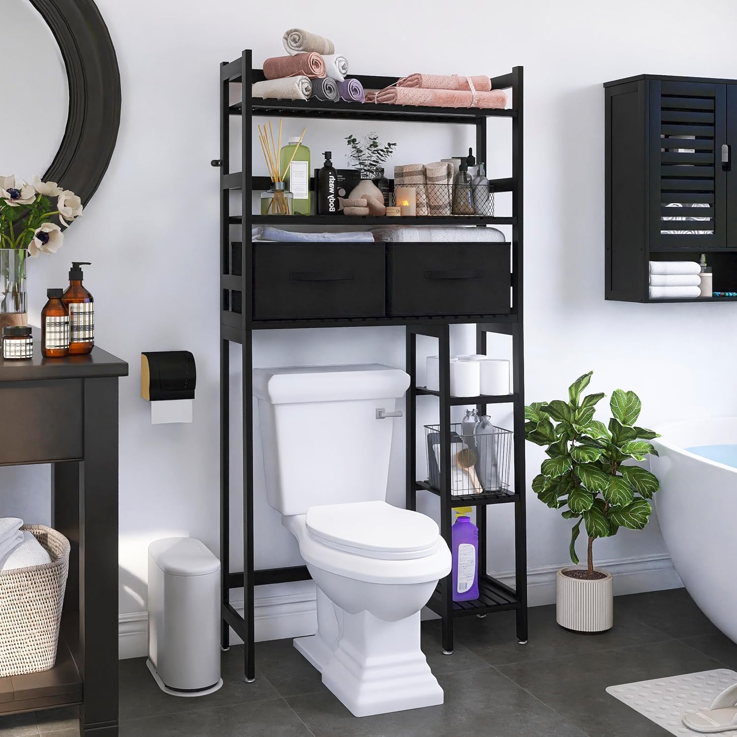 SMIBUY Over-The-Toilet Storage Rack, 6-Tier Bamboo Large Bathroom Organizer with Side Shelves and 2 Drawers, Stable Freestanding Space Saver for Bathroom, Laundry Room(Black)